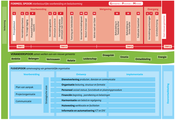 Afbeelding: Deze afbeelding schetst de tijdlijn van het herindelingsproces en de drie parallelle sporen daarin (overgenomen uit Handboek gemeentelijke herindeling, Ministerie van Binnenlandse Zaken en Koninkrijksrelaties, 2020).
